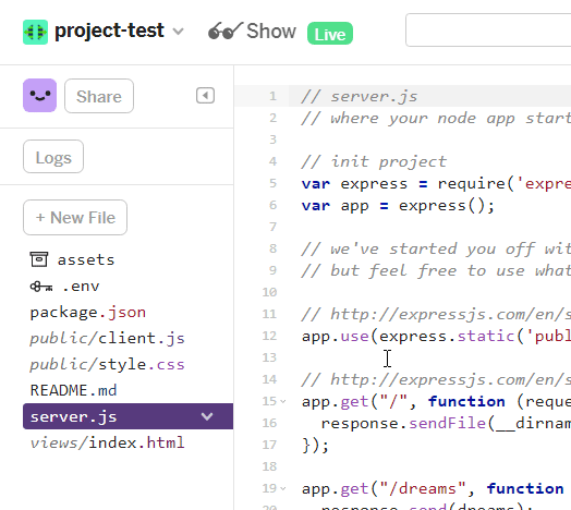 Usted puede empezar a codificar de inmediato. El proyecto determinado es un sitio web server.js. No lo elimines todavía, necesitaremos algo de ese código para más adelante, nesecitamos configurar algunas cosas, incluyendo asegurarnos de que el proyecto permanezca en línea y protegiéndolo creando una cuenta.